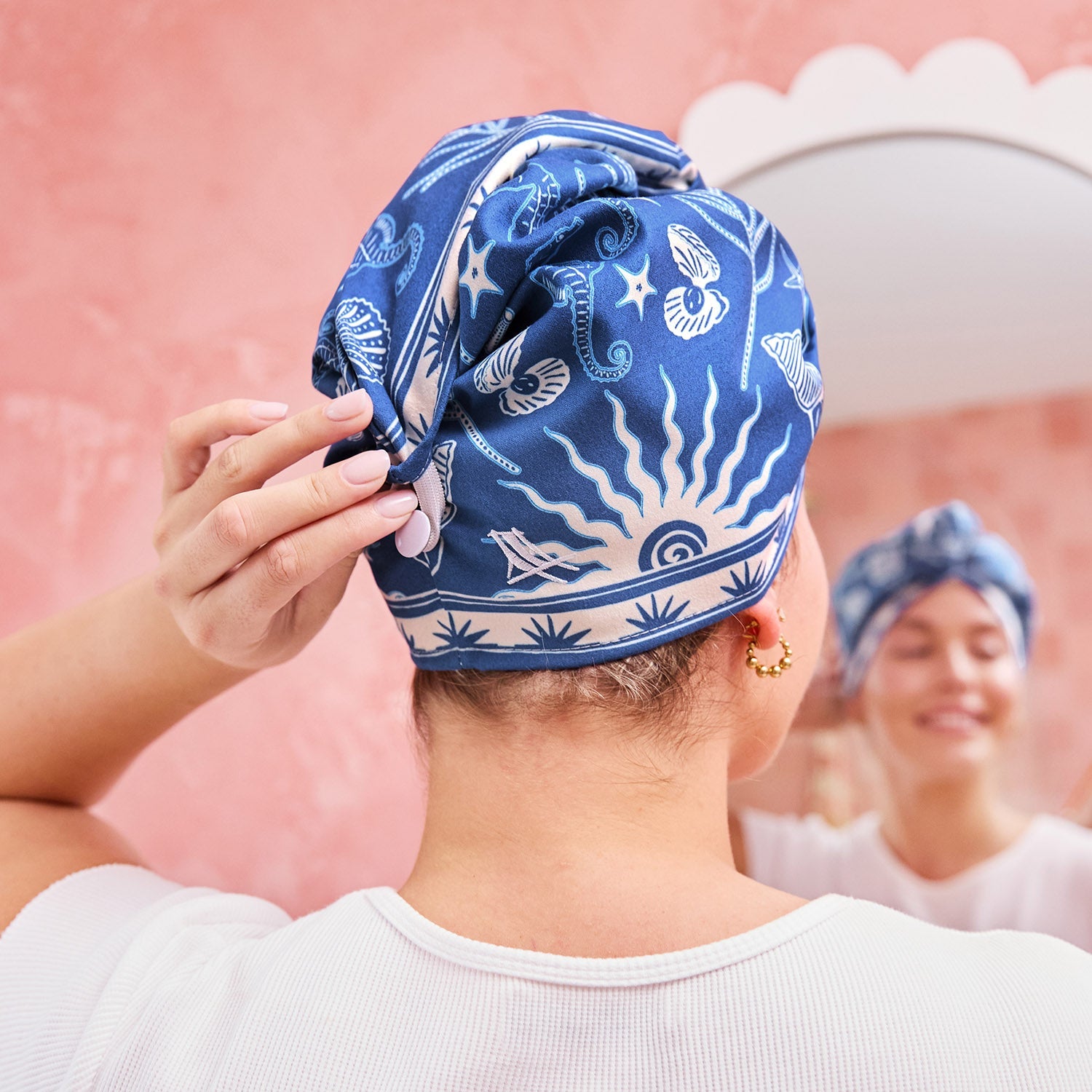 Hergestellt aus unserem hochwertigen recycelten DryQ™-Gewebe, ist es leicht (keine Nackenschmerzen mehr), super saugfähig und sanft zum Haar. Das Wickel- und Knopfdesign hält es sicher an Ort und Stelle, so dass Sie sich Ihrer Routine widmen können, während es seine Wirkung entfaltet. Das schleifenlose Gewebe sorgt für weniger Reibung, weniger Frizz und rundum glücklicheres Haar.