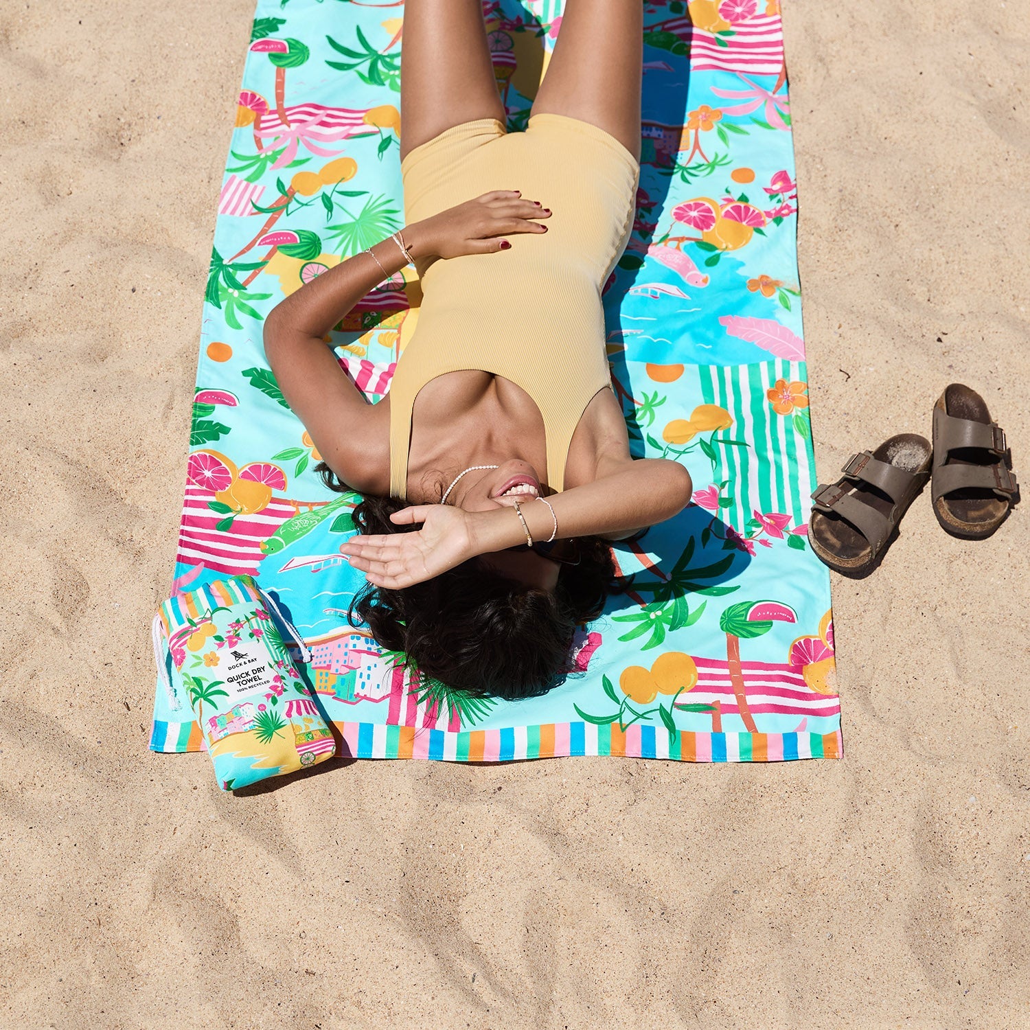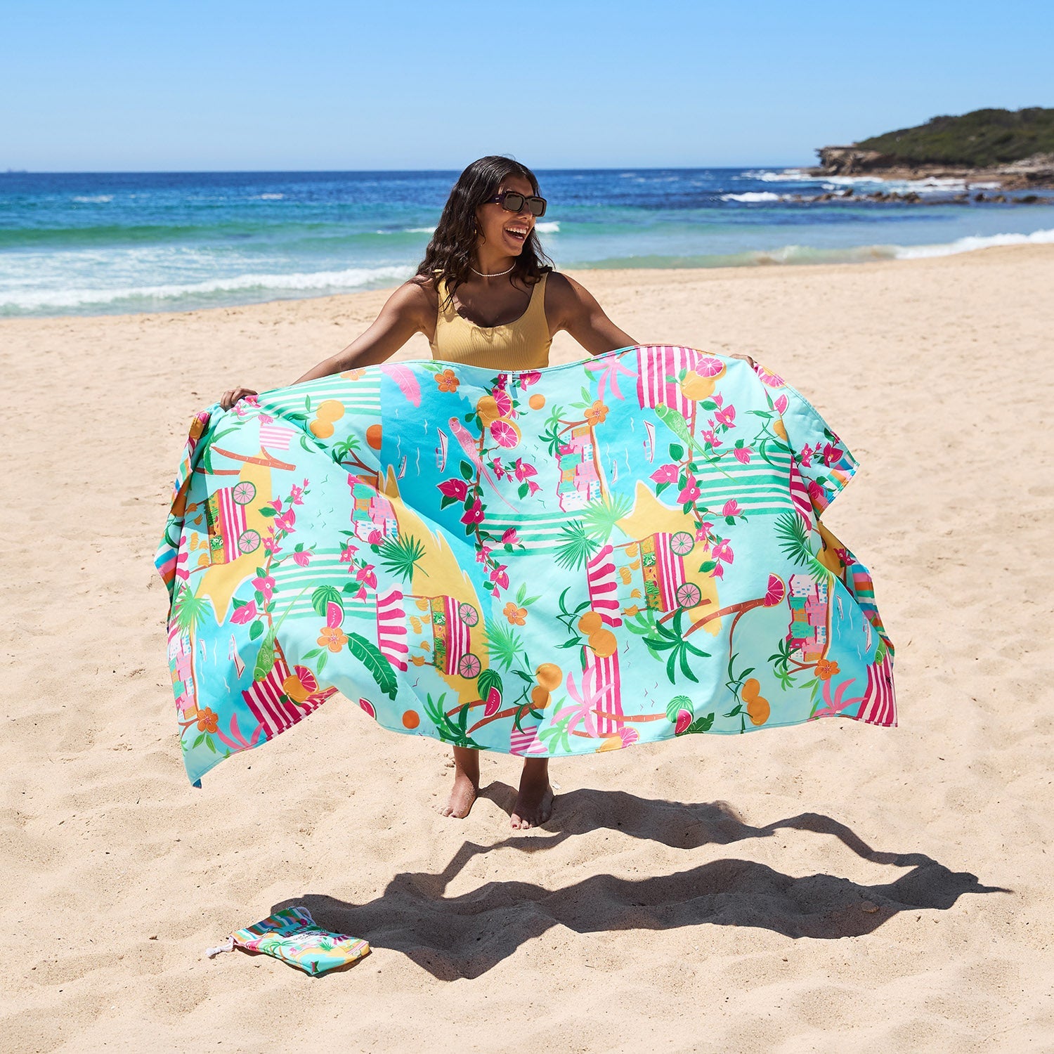 Hergestellt aus unserem hochwertigen DryQ™-Gewebe aus 100 % recyceltem Material, trocknet es viel schneller als herkömmliche Baumwollhandtücher und nimmt keine feuchten Gerüche an. Sand schüttelt sich sofort ab, es lässt sich klein in seinem ikonischen Beutel verstauen und ist im Handumdrehen wieder einsatzbereit.