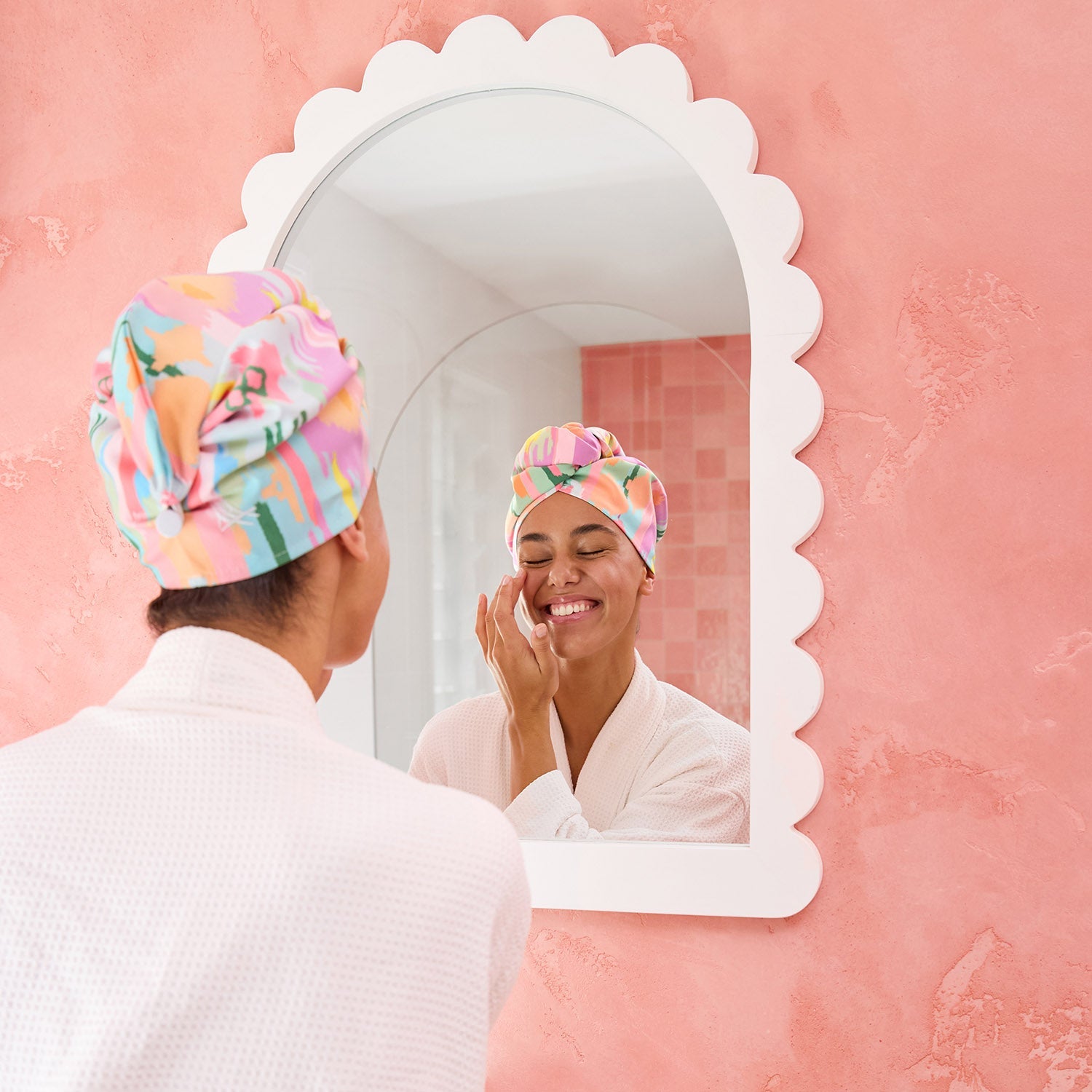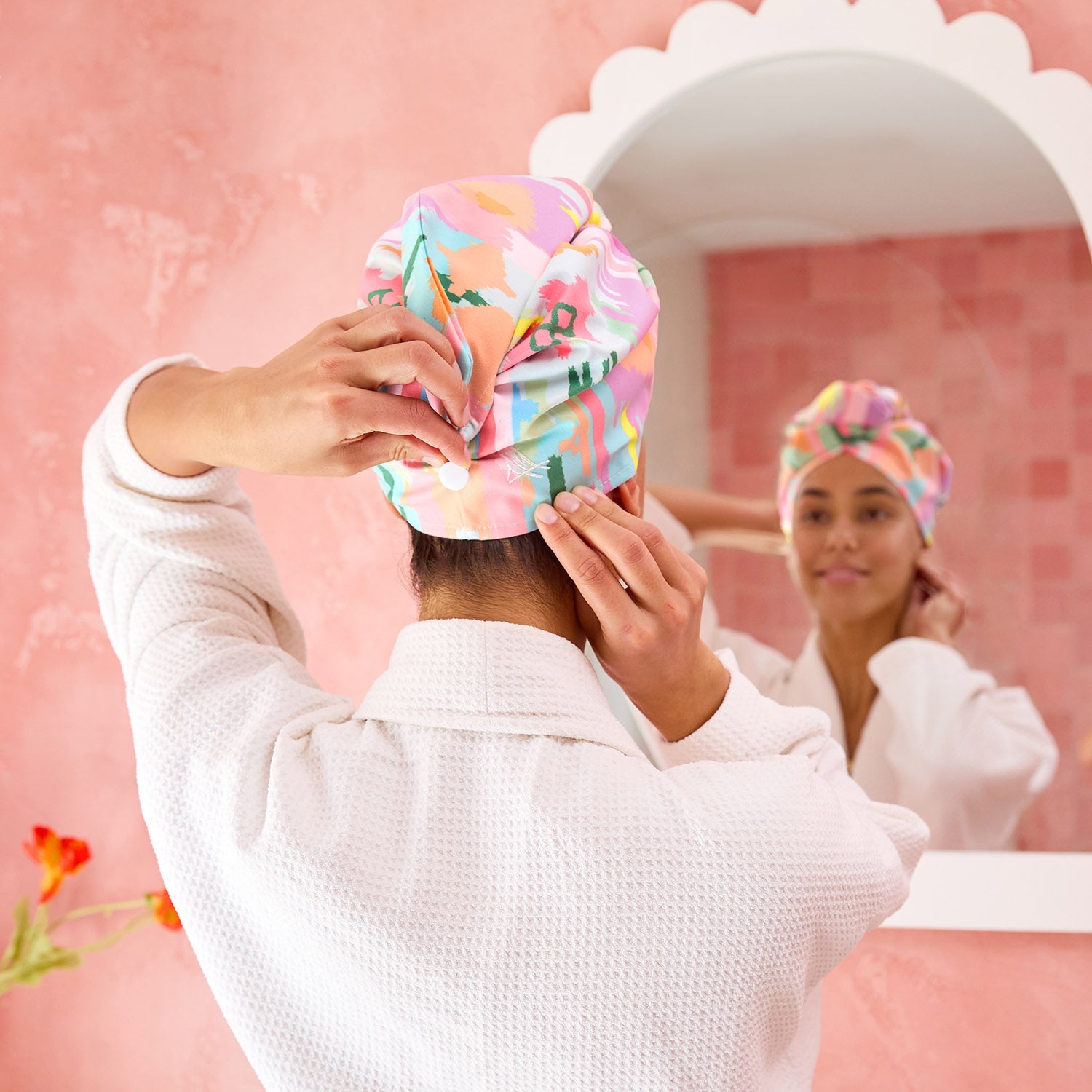 Fabriquée à partir de notre tissu recyclé DryQ™ de première qualité, elle est légère (fini les douleurs au cou), super absorbante et douce pour les cheveux. Le design enveloppant et le bouton la maintiennent bien en place, vous permettant de continuer votre routine pendant qu'elle opère sa magie. Le tissu sans boucles réduit les frottements, les frisottis et rend les cheveux plus heureux en général.