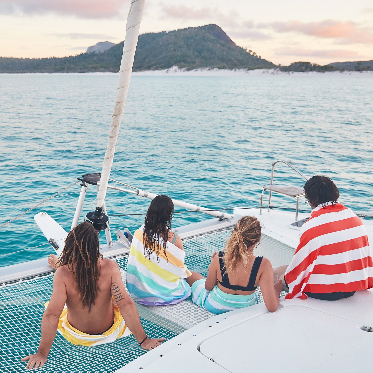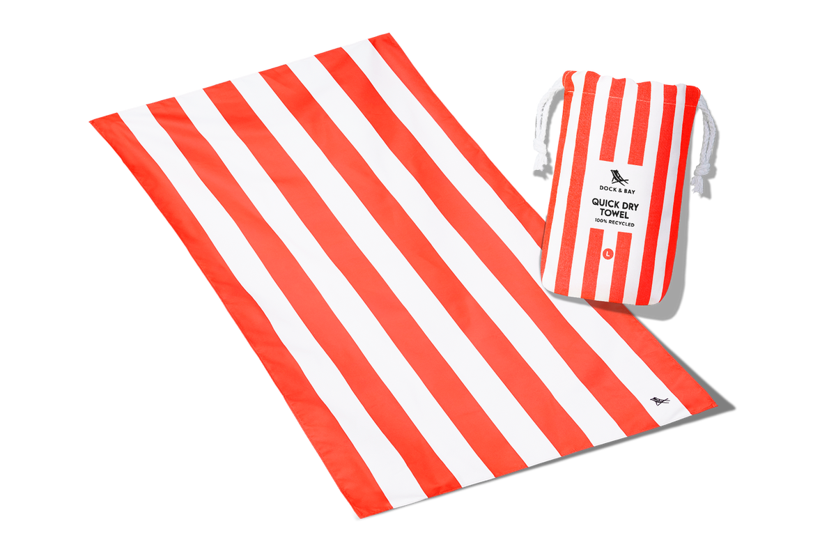 Our towels are made from 100% recycled materials using our unique DryQ™ fabric. Unlike cheaper microfiber towels, ours are super soft on your skin with no scratchy feel. The loop free design means sand won’t stick (even wet sand), and it won’t fray over time. Plus, our iconic pouch lets the towel pack down incredibly small, making it perfect for suitcases or backpacks.